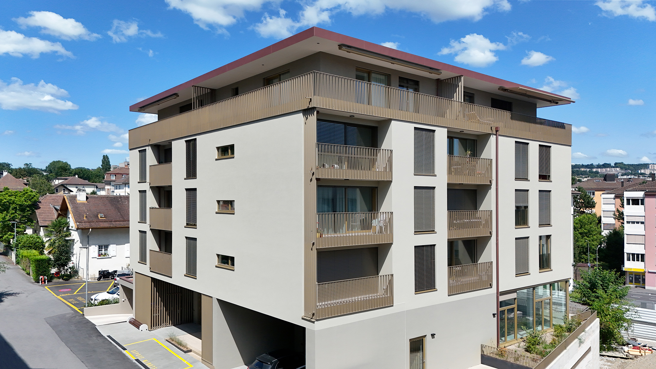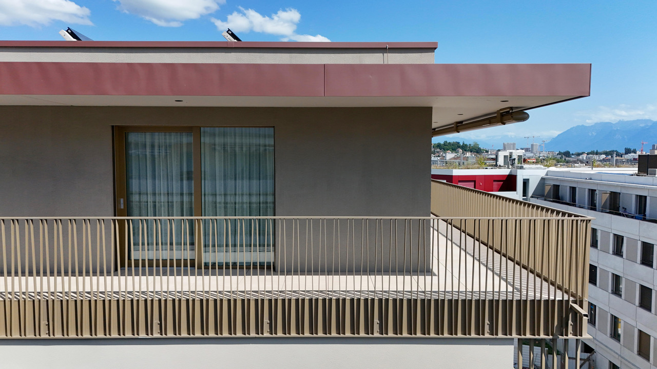 Chaque logement dispose d’un balcon ou, pour les attiques, de spacieuses terrasses offrant une vue dégagée sur la ville et les montagnes. L’immeuble propose également des espaces de stationnement pour vélos, de courte et longue durée, ainsi qu’une zone dépose-minute. Les appartements allient raffinement et modernité, avec des parquets en chêne, des murs clairs favorisant la luminosité et des cuisines équipées d’appareils haut de gamme. La qualité des matériaux et le soin apporté aux finitions confèrent au projet un haut niveau de confort, répondant aux besoins d’une clientèle variée, des étudiants aux seniors, grâce à des logements accessibles et bien pensés.