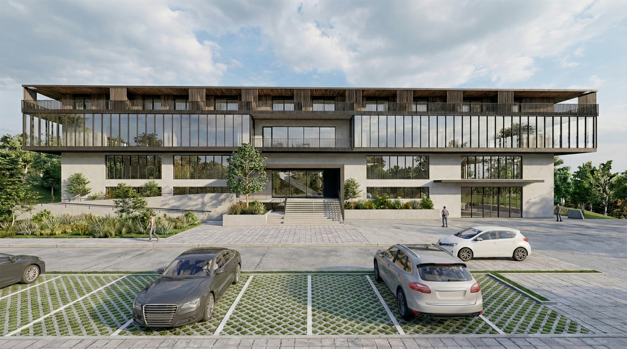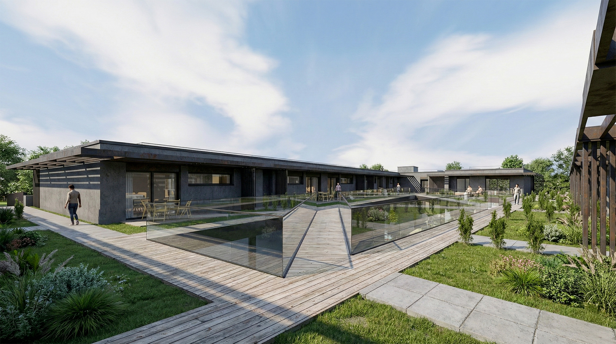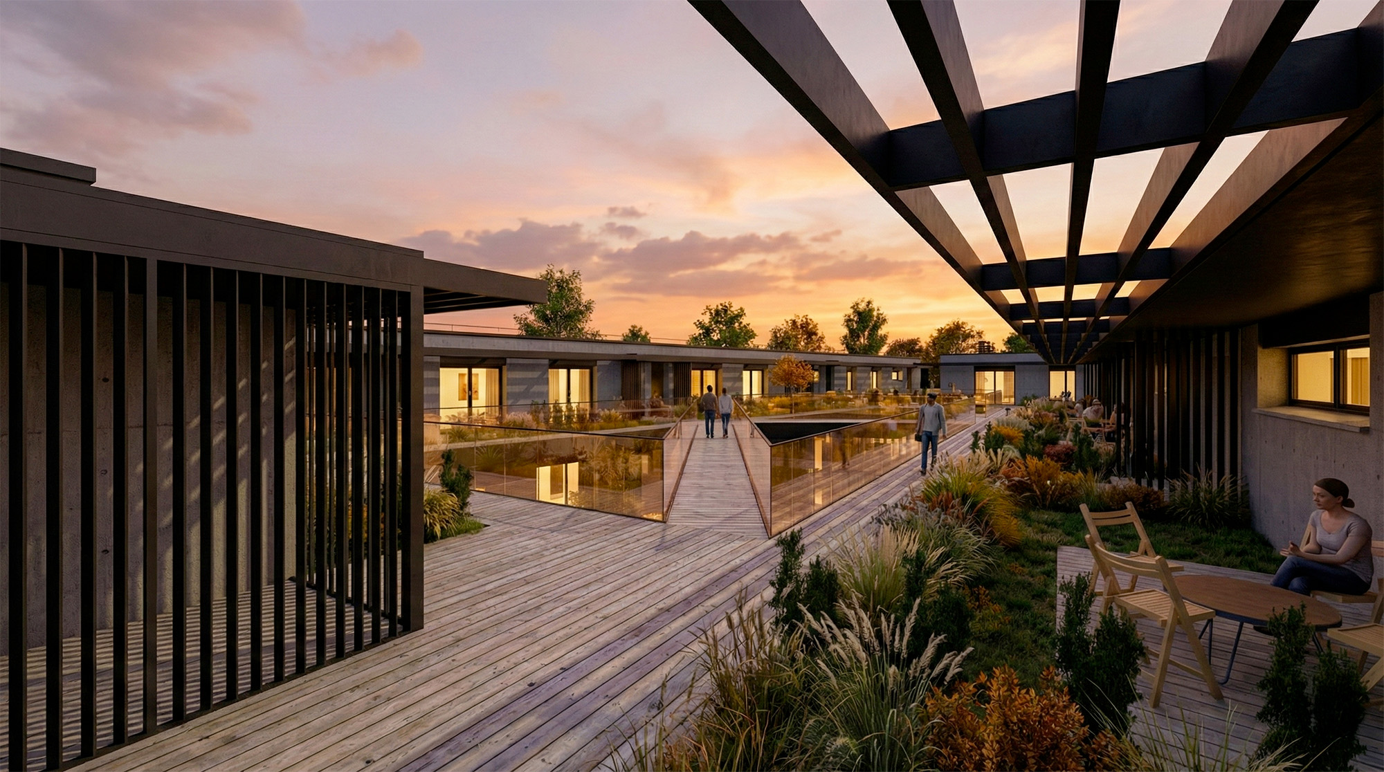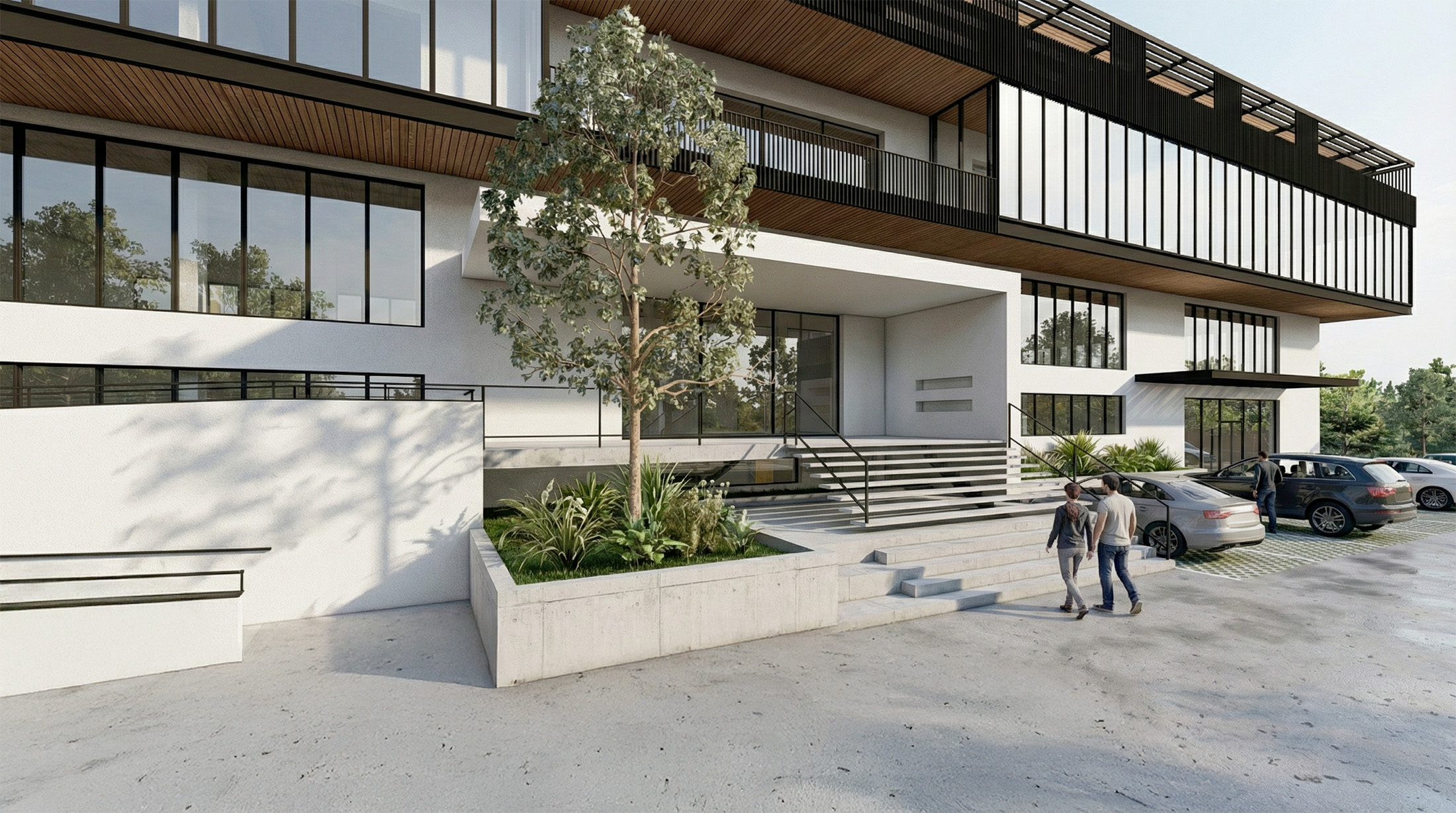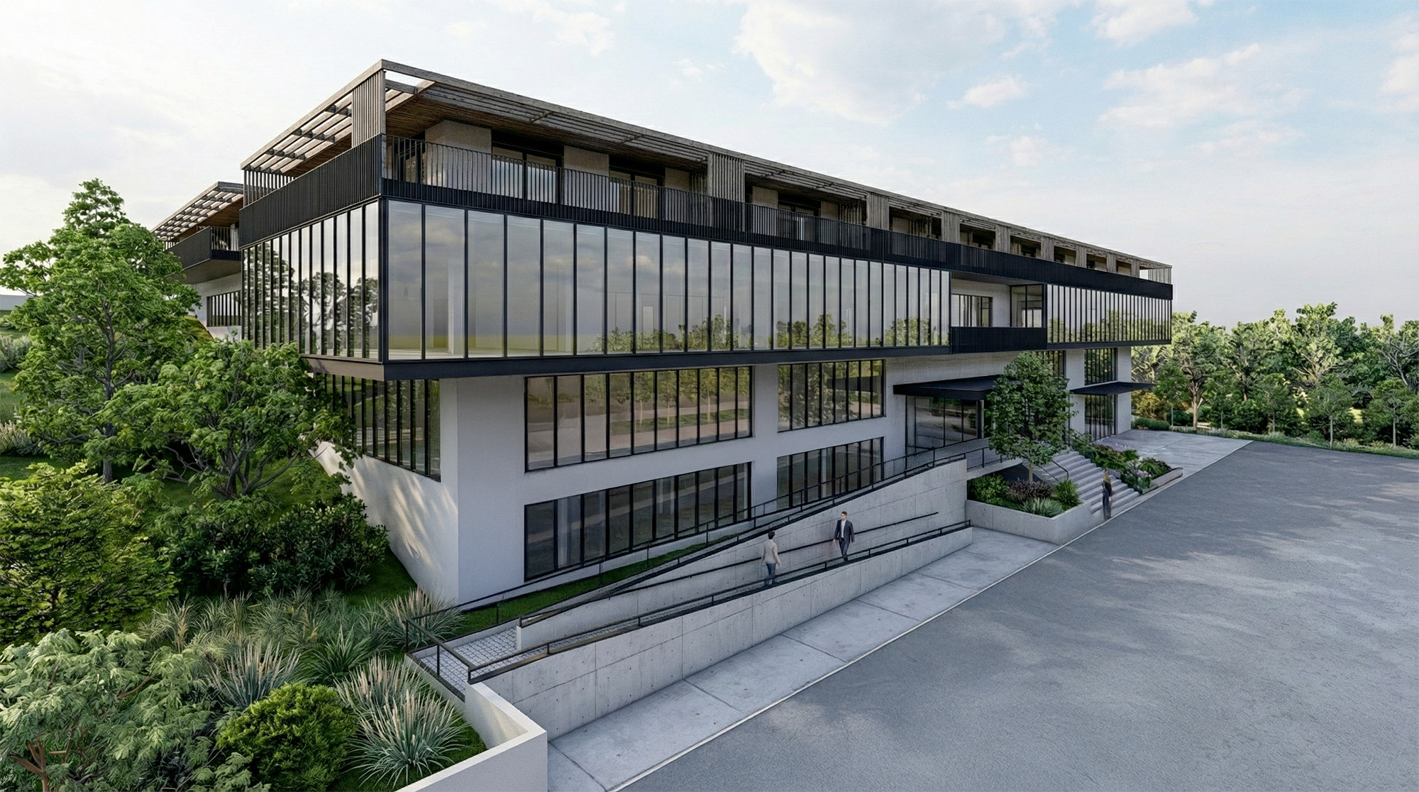 L’ensemble affirme une image contemporaine aux lignes épurées, portée par des finitions soignées et des circulations extérieures qualitatives composées de patios, coursives et passerelles. Les logements prennent place dans les niveaux supérieurs accessibles depuis la partie haute du terrain, tandis que les affectations professionnelles et artisanales s’organisent naturellement dans les niveaux inférieurs. Le projet est actuellement déposé à l’enquête auprès de la commune d’Echandens.