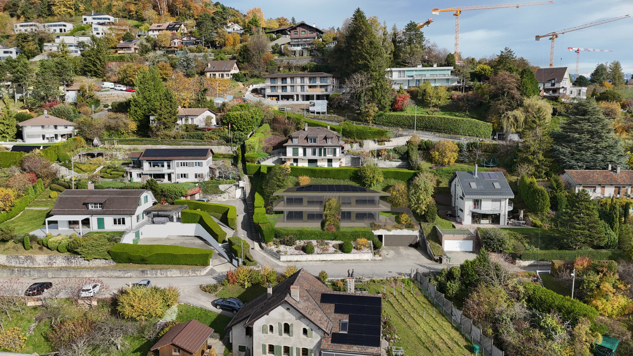 Construction nouvelle d’une habitation mitoyenne de deux logements au coeur du vignoble en terrasses du Lavaux classé au patrimoine mondial de l’humanité; avec en toile de fond un majestueux dégagement sur le lac Léman et les Alpes françaises. La construction aux tons allusifs au pied de vigne tend à se fondre au coteau avec ses façades finement bardées de bois.